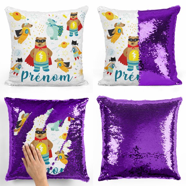 Créez en 2 secondes votre Coussin sequin magique à paillettes avec motif Animaux super-héros en le personnalisant avec le prénom de votre enfant !
