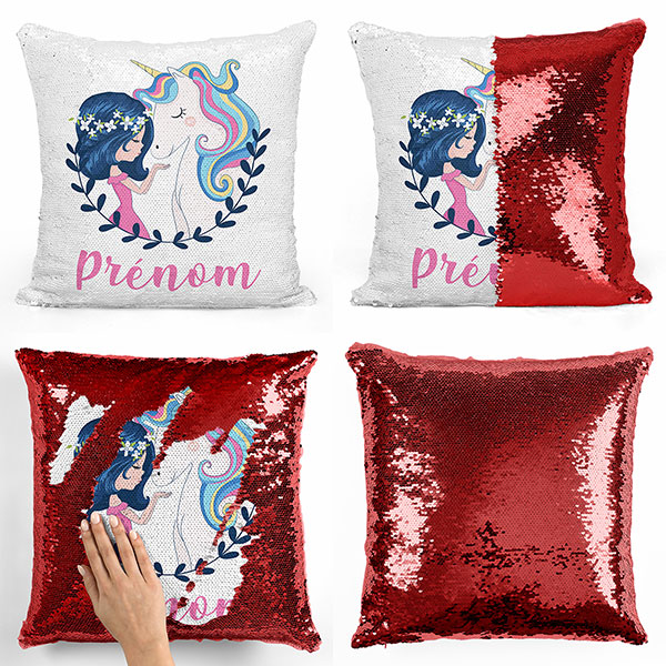 Créez en 2 secondes votre Coussin sequin magique à paillettes avec motif Fille et licorne en le personnalisant avec le prénom de votre enfant !