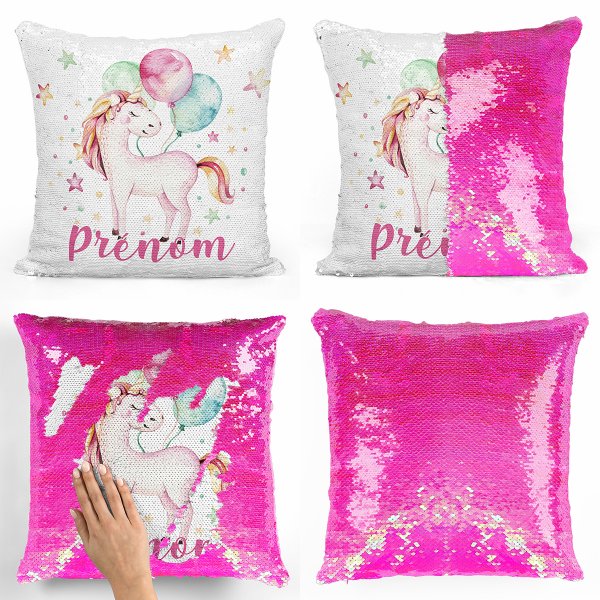 Créez en 2 secondes votre Coussin sequin magique à paillettes avec motif Licorne ballons en le personnalisant avec le prénom de votre enfant !